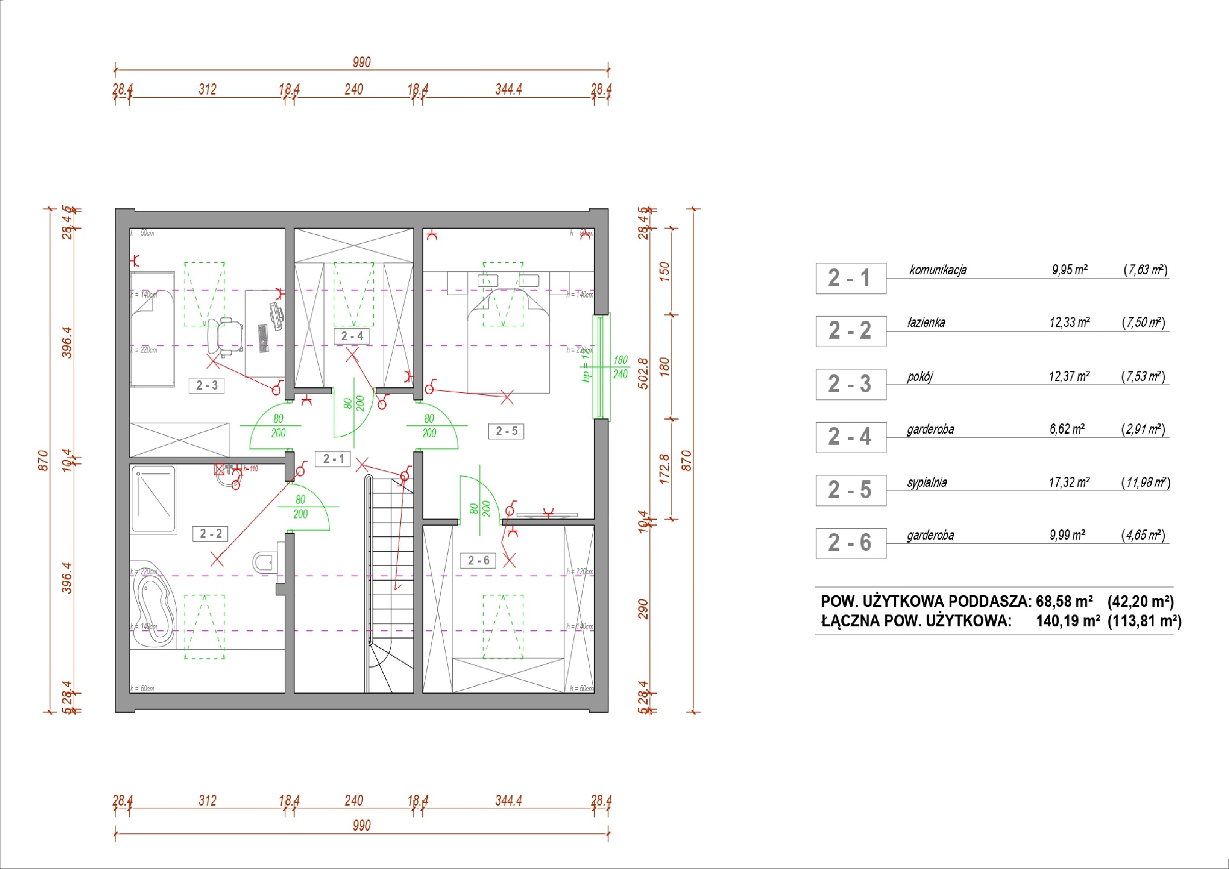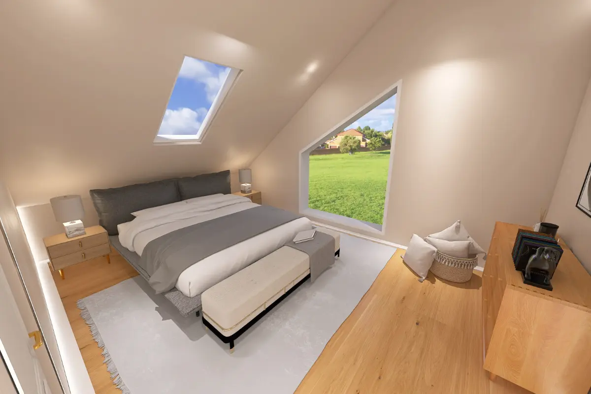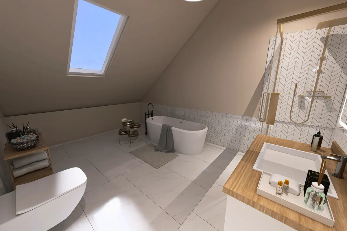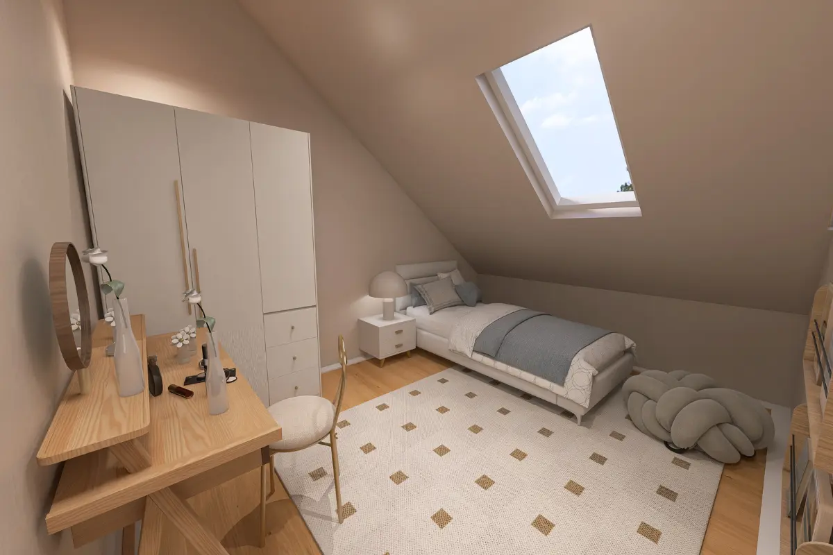 Poddasze ma powierzchnię 68,58 m². Znajdują się tu łazienka, pokój, sypialnia, dwie garderoby oraz część komunikacyjna, zapewniające komfort i maksymalne wykorzystanie przestrzeni mieszkalnej.