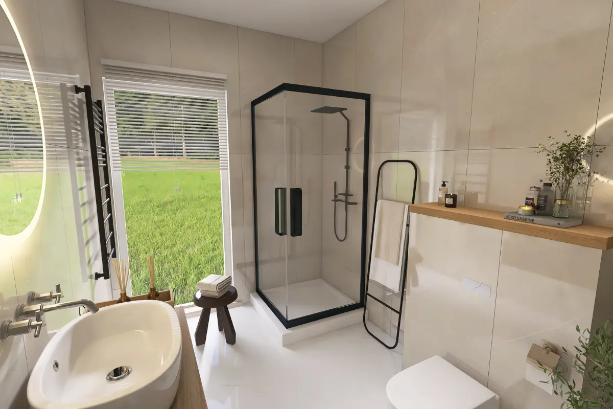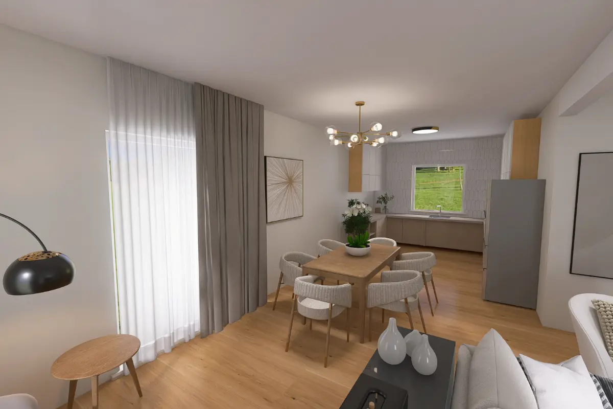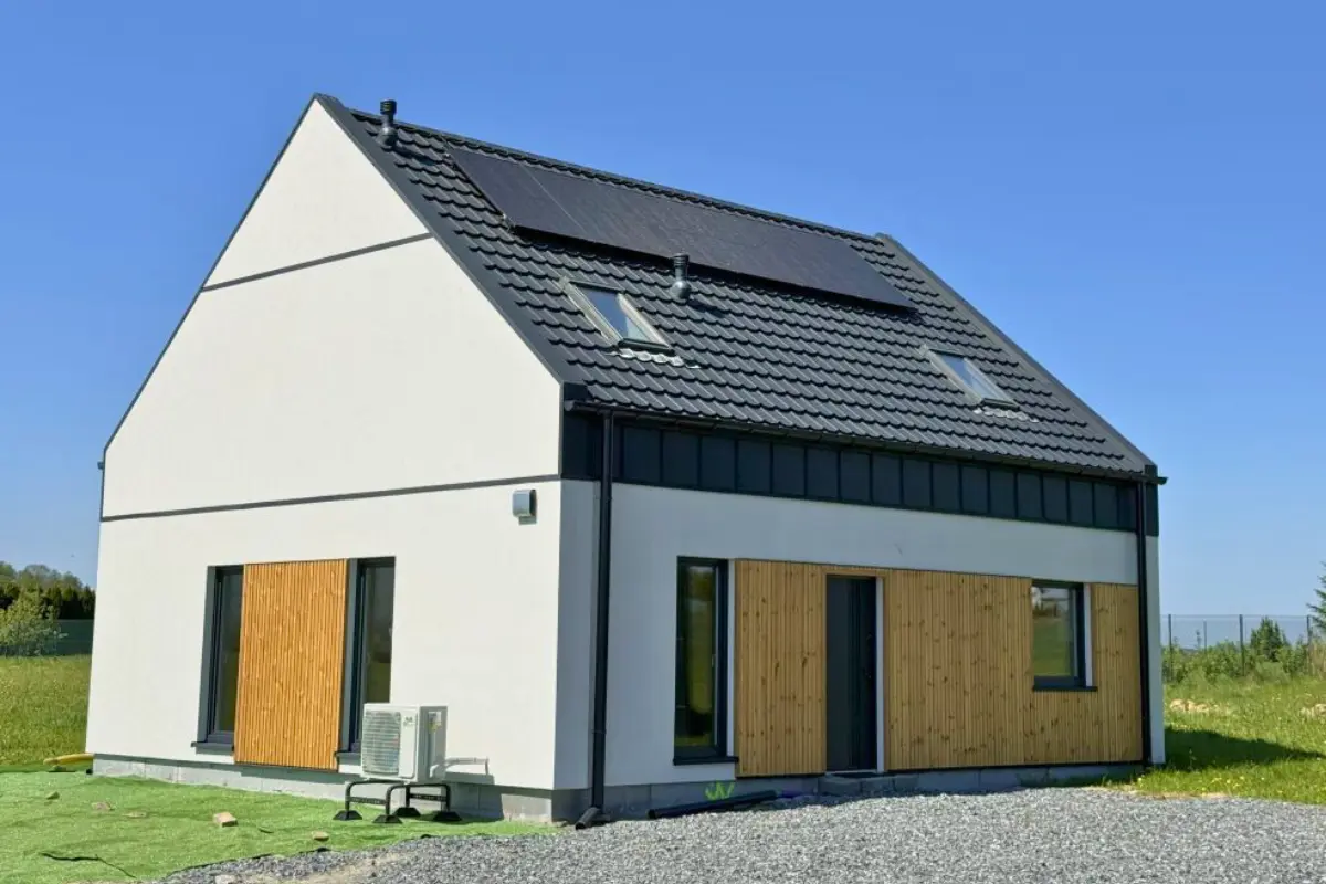 ZeroDom to nowoczesny dom niskoenergetyczny, zaprojektowany z myślą o minimalnych kosztach utrzymania. Wyposażony m.in. w pompę ciepła, fotowoltaikę, zbiornik CWU 200 l oraz zbiornik na deszczówkę, łączy ekologię z komfortem codziennego życia. Stonowana elewacja w bieli i jasnym dębie nadaje mu elegancki, ponadczasowy charakter, a duże przeszklenia zapewniają doskonałe doświetlenie wnętrz. 140 m² powierzchni netto (113,81 m² użytkowej) to przestronny salon z kuchnią oraz 3 pokoje, 2 łazienki, 2 garderoby i pomieszczenie gospodarcze.